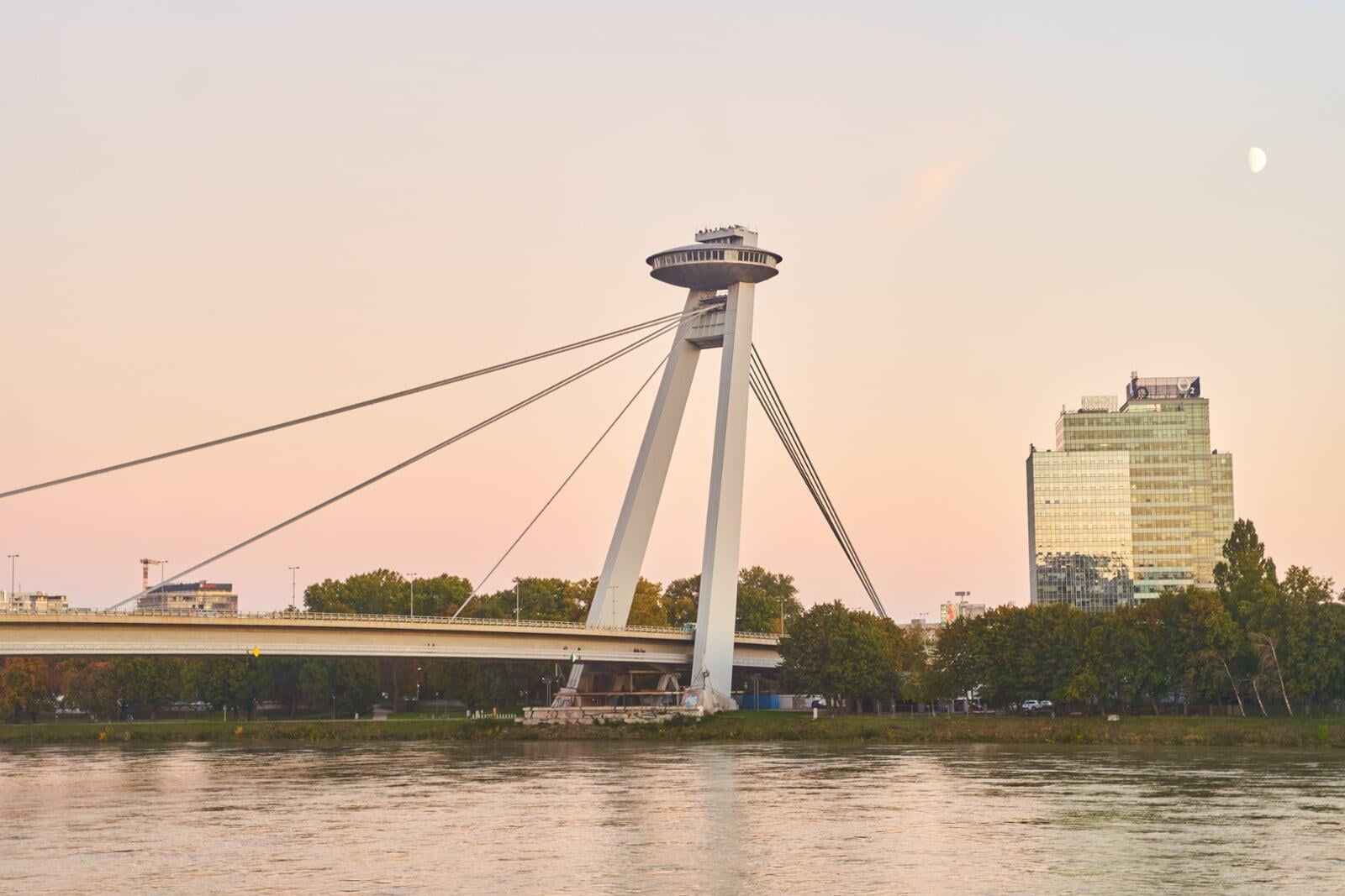 Overlooking the city, the tower provides TV and radio signal to Bratislava and its surroundings. The shape of a wine bottle should refer to the adjacent wine region.
